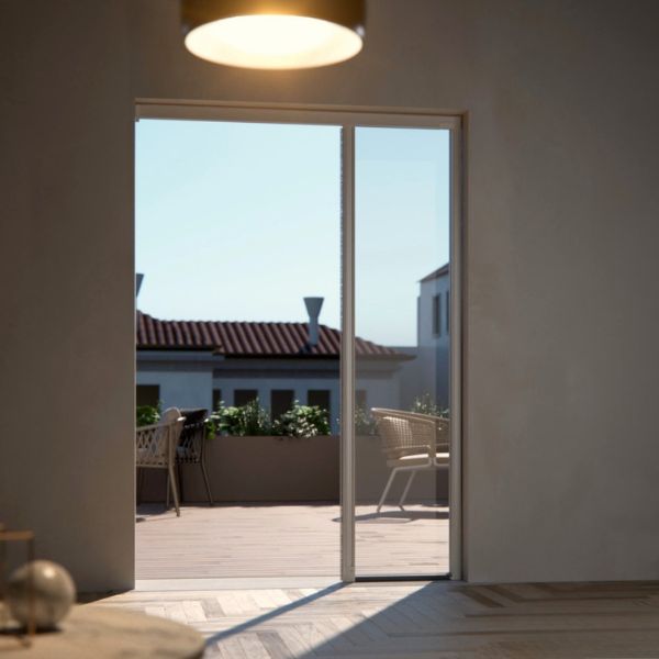 Miniscenica® evo rappresenta l’evoluzione tecnologica applicata agli spazi contenuti. Con un ingombro di soli 40 mm, questa zanzariera offre tutta la comodità della serie Scenica® – ovvero l’assenza totale di barriere a pavimento – in una struttura ancora più snella. Grazie al tappo compensatore di serie, può essere installata anche in assenza di pareti posteriori al cassonetto, rendendola estremamente versatile. La sua natura reversibile e la possibilità di installazione senza viti, tramite uno speciale biadesivo ad alta tenuta, la rendono la scelta preferita per chi cerca praticità, estetica e protezione in un unico prodotto Made in Italy.