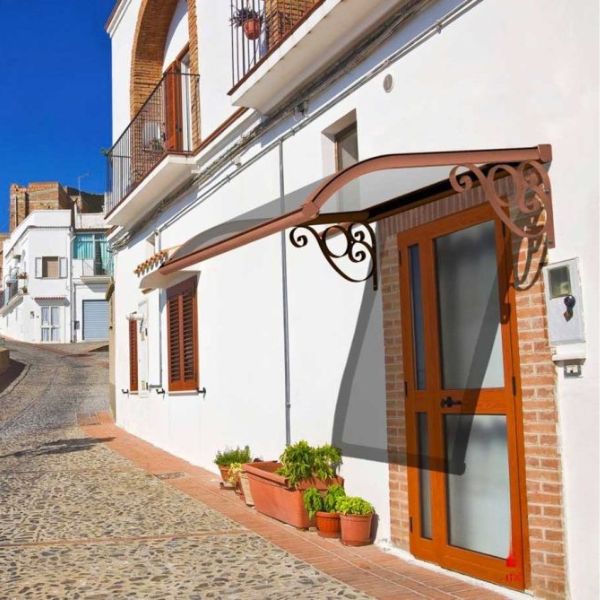 La R443 รจ la pensilina fissa ideale per contesti che richiedono un tocco di eleganza classica. Si distingue per i suoi supporti finemente lavorati in ferro battuto, che richiamano la tradizione artigianale italiana. Abbinata a una copertura in policarbonato resistente, questa struttura offre una protezione sicura contro le intemperie, integrandosi armoniosamente in edifici storici, ville o casali, dove l’estetica gioca un ruolo fondamentale.