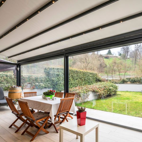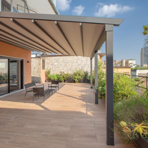 La R128 Pergotesa è la soluzione ideale per chi desidera una struttura addossata dal design leggero ma estremamente robusto. Realizzata interamente in alluminio, questa pergola è dotata di un telo in PVC oscurante che si raccoglie a pacchetto, permettendo di gestire liberamente luce e ombra. Grazie al suo profilo equilibrato, si integra con naturalezza in contesti residenziali e commerciali, offrendo un riparo efficace contro sole e pioggia.