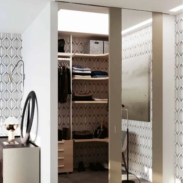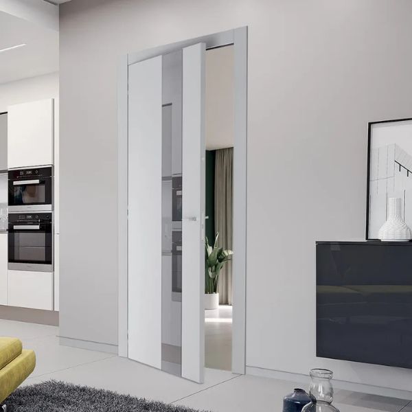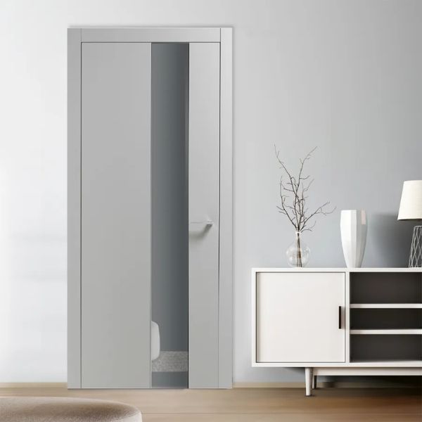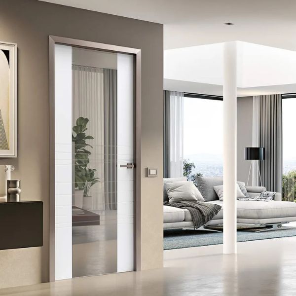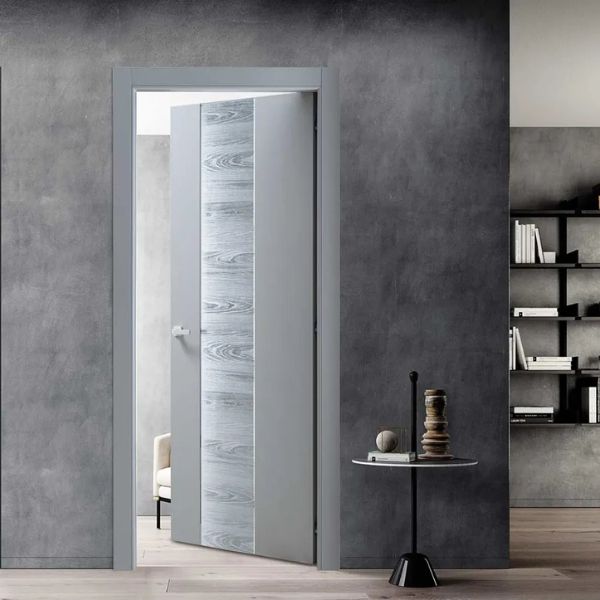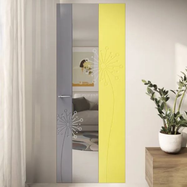 La linea Reflex si distingue per l’integrazione artistica tra superfici laccate e inserti in specchio. Il decoro inciso sul pannello prosegue con continuità visiva sulla parte riflettente grazie a tecniche di sabbiatura avanzate. È una collezione che trasforma la porta in un elemento d’arredo luminoso, capace di dilatare gli spazi e creare eleganti giochi di luce negli interni contemporanei