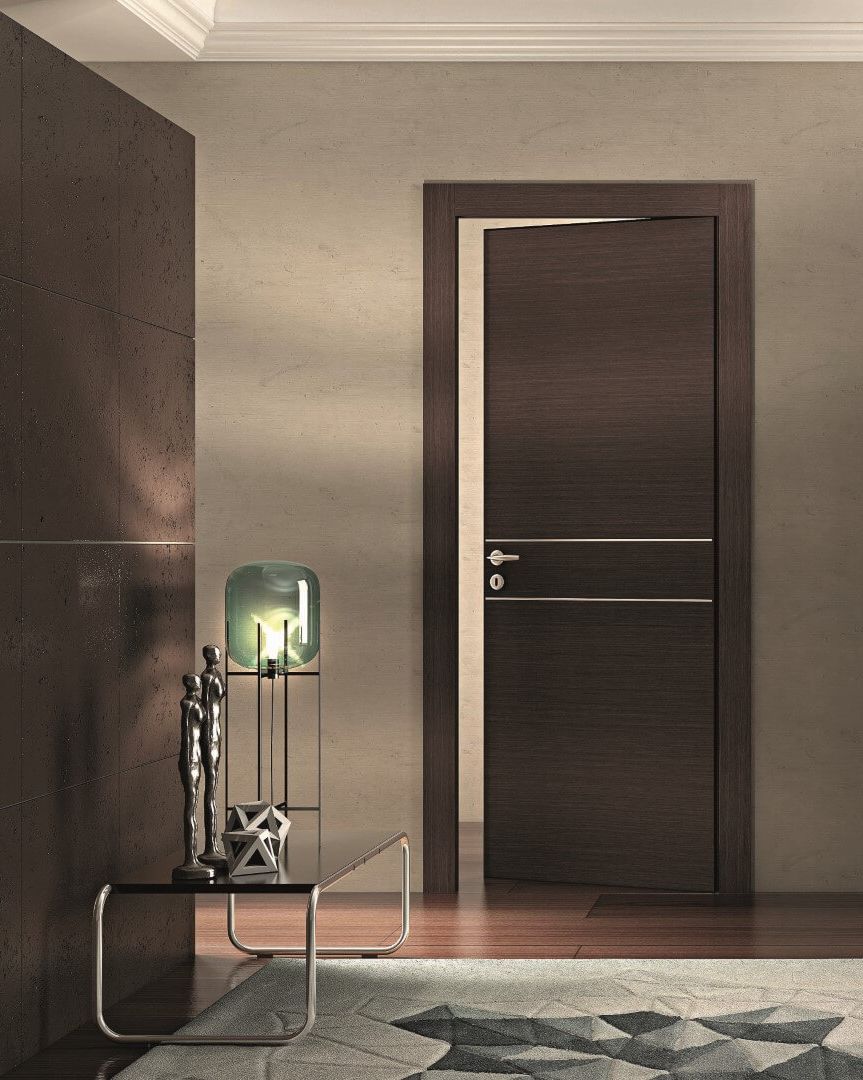 Porta decorata con inserti metallici, design geometrico e contrasti materici.