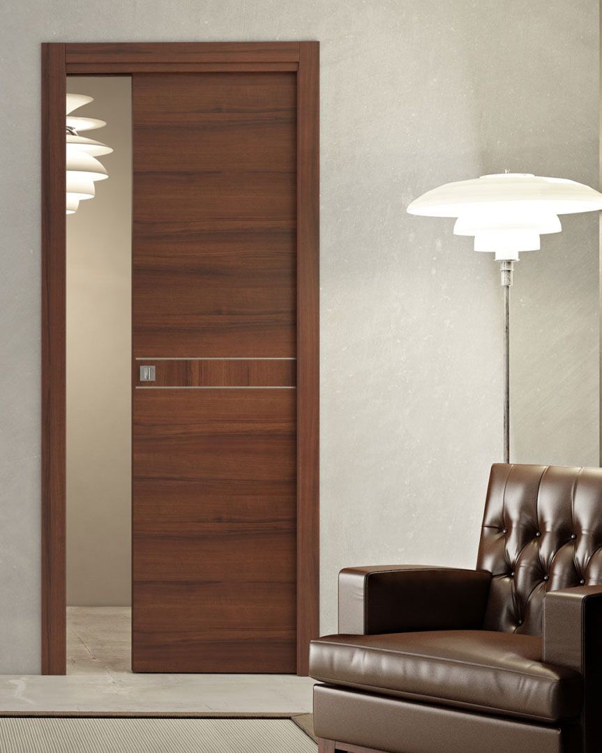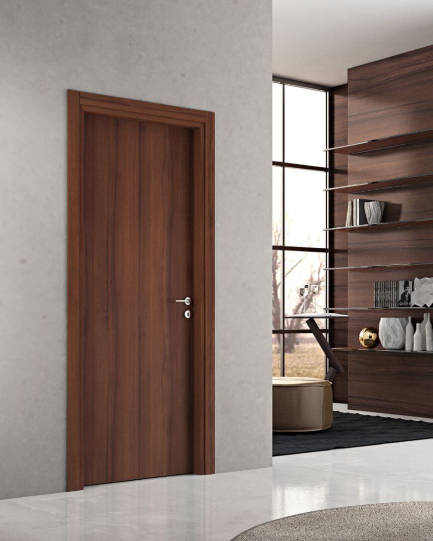 Porta decorata noce nazionale, venature verticali e stile classico senza tempo.