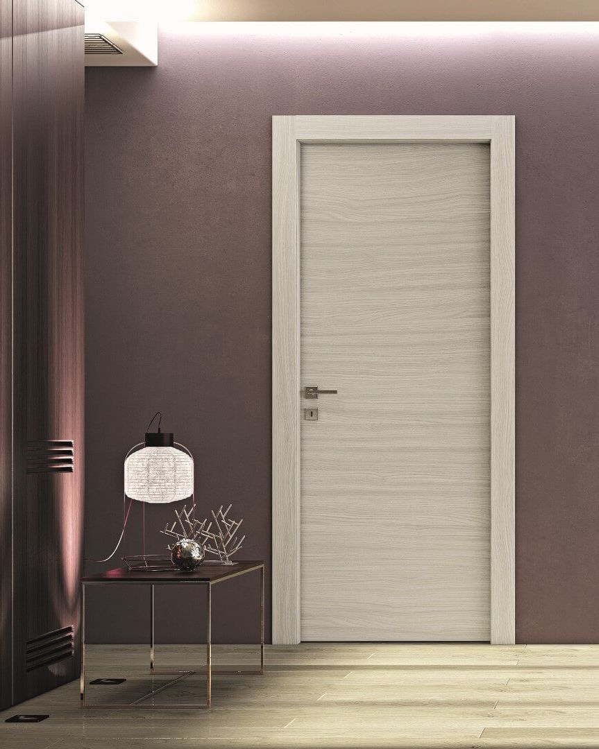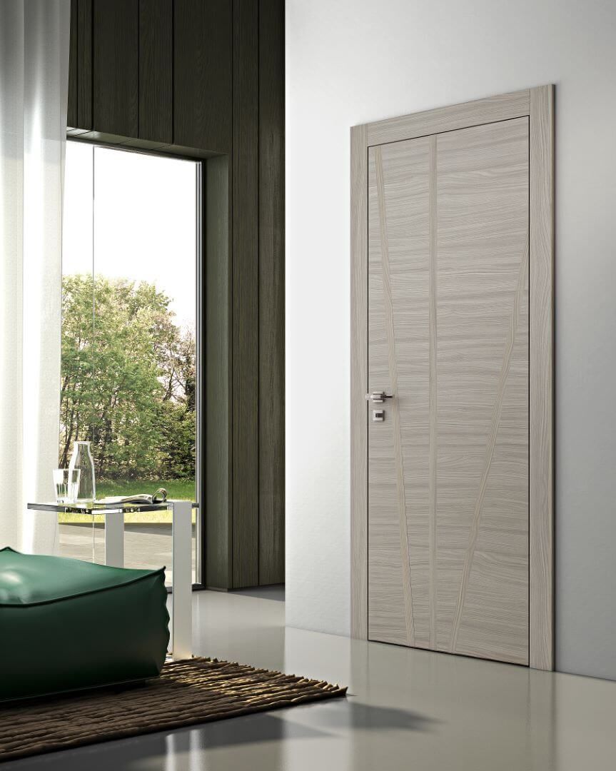 Porta decorata grigio olmo, design austero contemporaneo e ispirazione naturale.