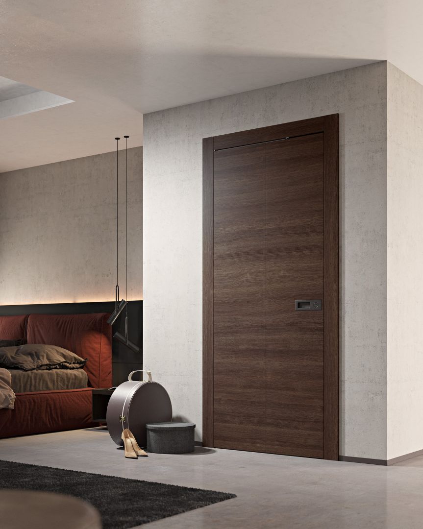 Porta rovere moka scuro, venature decise e grande impatto visivo.